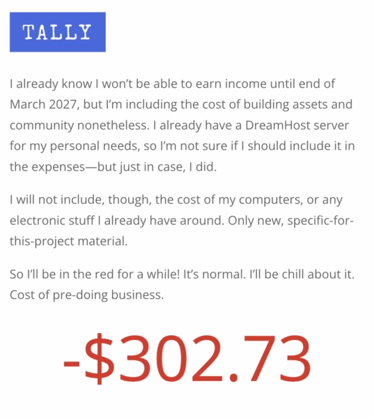 Why a Grand Tally? Isn’t this a bit disheartening, since I am not allowed to work for two years minimum? Well, no. I am chomping at the bit, I won’t lie, but I also accept that I have to work within this set of rules where I won’t earn any money with my project in that timeframe.