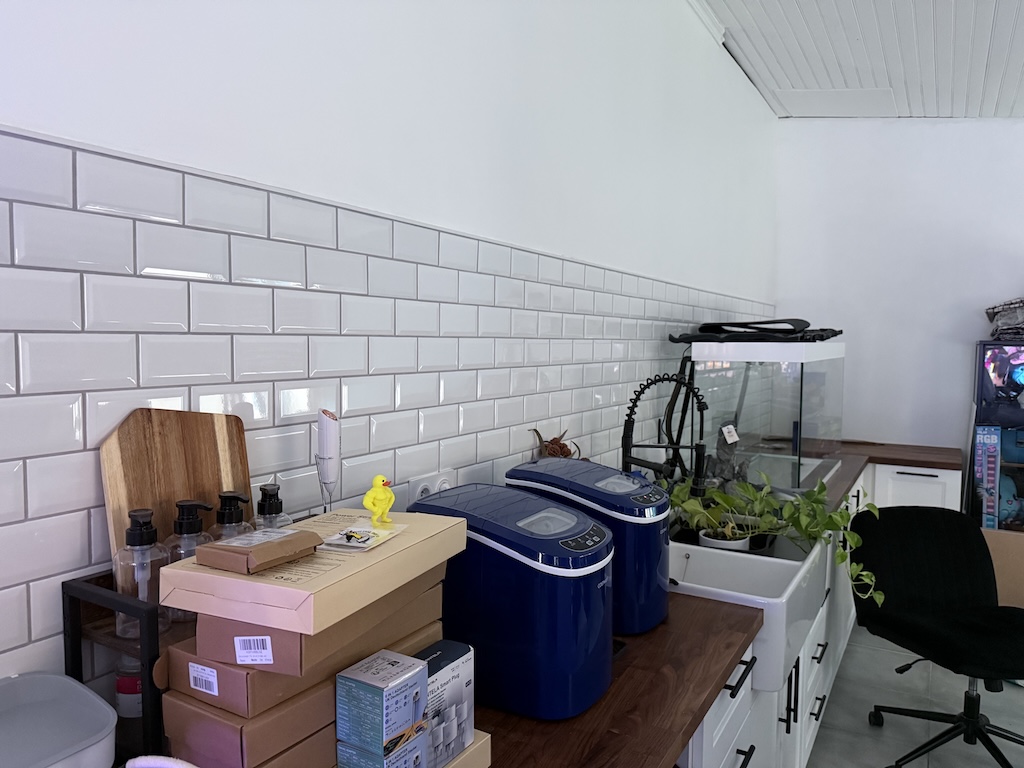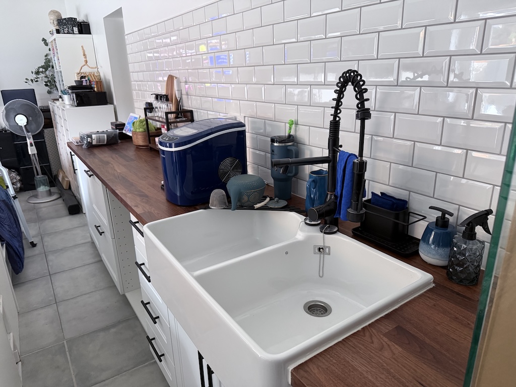 I enjoy that kitchenette very much: I have a dedicated space to make tea, coffee, or ice cubes. I have a tiny fridge where I can store some diet cokes (because otherwise I never find any after the kids locust them up in the common fridge. The double sink is great too—one sink, on the left, for dishes and stuff like that, and one on the right for messier stuff like paint, plants watering, and in the near future changing water of my big aquarium.
